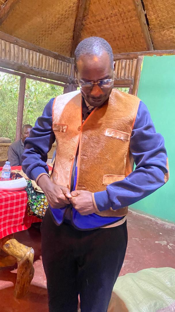 Left, right: Dr. Medard Twinamatsiko, the team leader of subproject 1, appreciating the cultural attire brought and displaying it in front of the Batwa