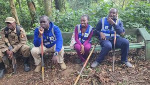 Left : The chief warden of UWA, Dr. Johnes Obungolonch; subproject 3 team leader, Ms. Hope Morian; subproject 3 assistant; and Dr. Medard Twinamastiko, subproject 1 team leader.